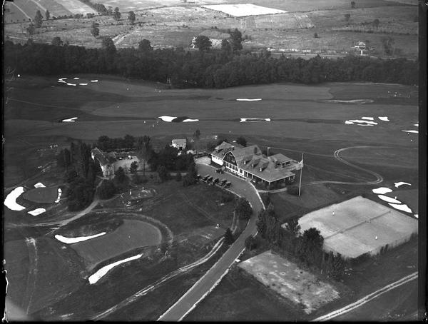 Aerial view of the Berkshire Country Club golf courses and club house. Bern Township Sports. Surrounding farmlands and the Schuylkill River are also visible. View 2712 is southwest to northeast. View 2765 is southeast to northwest with Schuylkill River visible on right side of image. View 2786 is from south to north with clubhouse visible. Probably taken September 12-16, 1922.