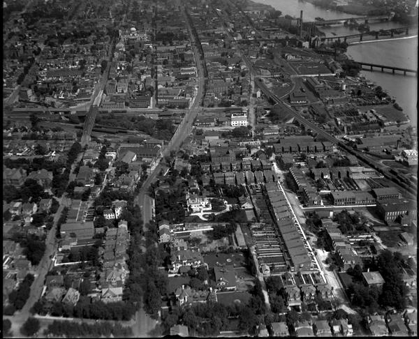 Aerial views of Norristown, Pennsylvania. Views show the downtown area from a vantage point above the Schuylkill River and look southeast of the city center towards residential areas along Ridge Pike/Main Street. The Montgomery County Courthouse and bridges over the river are also visible.