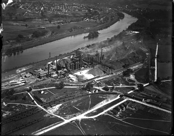 Aerial views of the Alan Wood Iron and Steel Company in Conshohocken, Pennsylvania. Views from higher and lower altitudes
