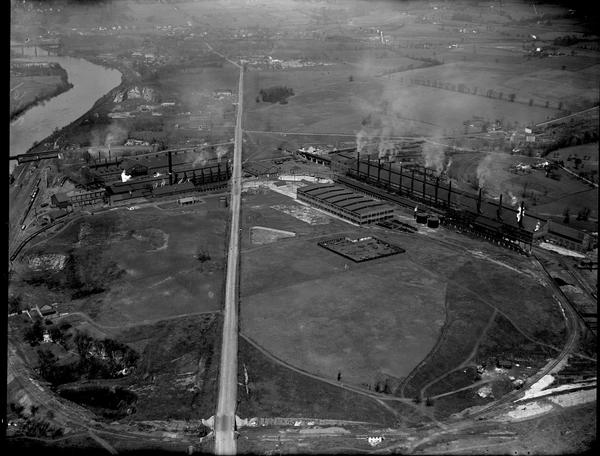 Aerial views of the Alan Wood Iron and Steel Company in Conshohocken, Pennsylvania. Views from higher and lower altitudes