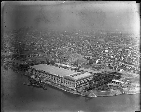 Aerial views of the American Bridge Company industrial facility on the Delaware River in Trenton, New Jersey. The company was formed In 1900 when the JP Morgan & Company undertook a consolidation of the bridge construction industry in the United States. This merger of 27 companies commanded 90 percent of the bridge building market in the U.S. Eventually, the American Bridge Company became a subsidiary of the U.S. Steel Corporation. The views show the facility from several angles. Railroad tracks and ships servicing the facility can be seen, as can adjacent residential areas.