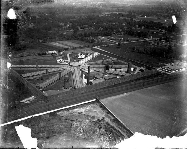 Aerial view of Holmesburg Prison, opened in 1896 on Torresdale Avenue in the Holmesburg section of Philadelphia. Shows central rotunda, from which eight blocks of cells extend. Designed by Wilson Brothers & Co. The prison closed in 1995.