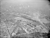 Aerial view of the University of Pennsylvania looking east across the Schuylkill River toward Center City. Includes views of the Quadrangle dormitories, Franklin Field, and the University Museum. Industrial activity along the Schuylkill River can be seen.