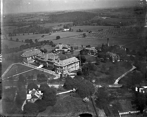 Aerial view of the campus of the Academy of the New Church in Bryn Athyn, Pennsylvania. Depicts Benade Hall and other original buildings constructed in the early 20th century. The institution, founded in 1876, is comprised of a Theological School, secondary schools, and Bryn Athyn College, all associated with the New Church or General Church of the New Jerusalem (commonly known as the Swedenborgian church).