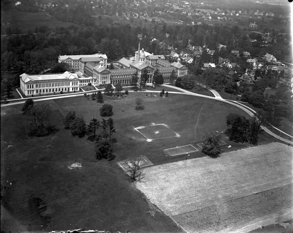 building built 1864-1871 and library opened in 1911. The outline of a baseball diamond can be seen on the lawn. St. Charles