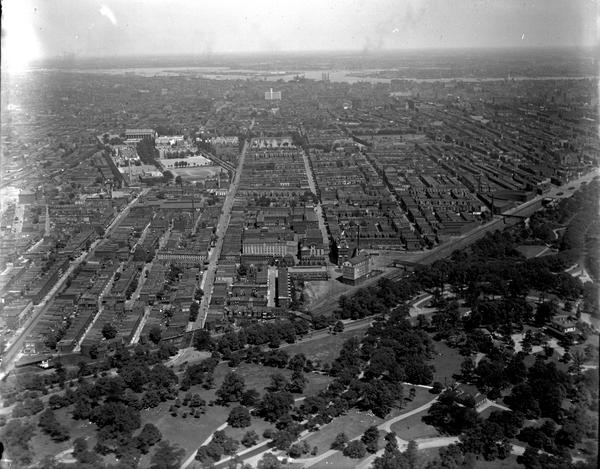 Aerial view of Philadelphia's Fairmount neighborhood, looking east from East Fairmount Park (foreground) to the Delaware River (background). View shows Girard College, the Corinthian Avenue Reservoir, and Eastern State Penitentiary in the distance. Also shows a railroad tunnel bordering the park. Row homes and factories are visible.