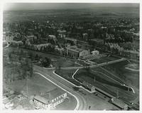 Aerial views of the campus of Princeton University, Princeton, New Jersey. Chartered 1746 as the College of New Jersey. Name changed to Princeton University in 1896. Depicts many campus buildings and two views (1228 and 1253) show nearby railroad station.