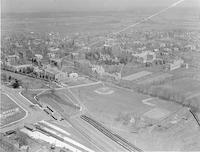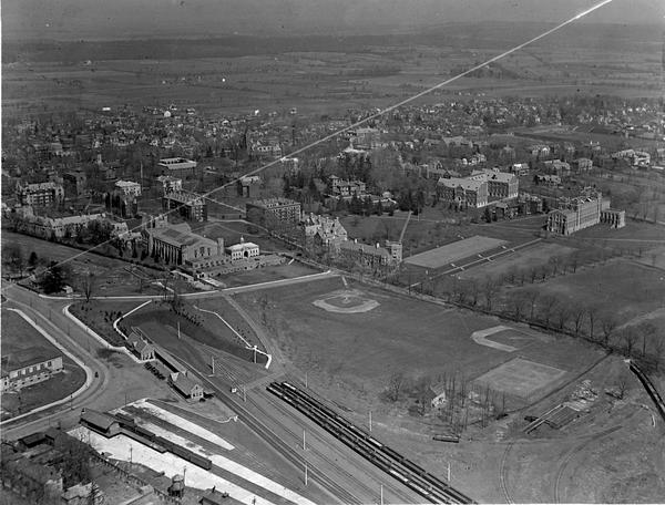 Aerial views of the campus of Princeton University, Princeton, New Jersey. Chartered 1746 as the College of New Jersey. Name changed to Princeton University in 1896. Depicts many campus buildings and two views (1228 and 1253) show nearby railroad station.