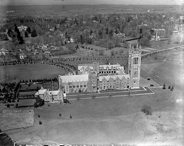 Aerial view of the Princeton University Graduate College located in Princeton, New Jersey. The ensemble of connected residential and dining halls were built in 1913 solely for the use of postgraduate students. Designs by Cram, Goodhue & Ferguson.