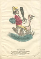 A tailor rides on a goose, has a head of cabbage on his back, and holds a bat that reads "The Ninth or Lousy." "Goose" refers