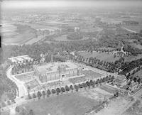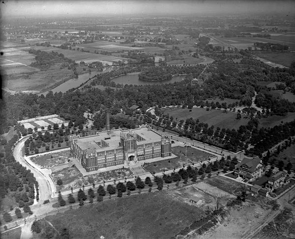 Aerial view of Camden High School, located at 1700 Park Boulevard in Camden, New Jersey. Built 1915 after designs by Paul Armon Davis, III. Opened 1918. View includes portion of the Cooper River.