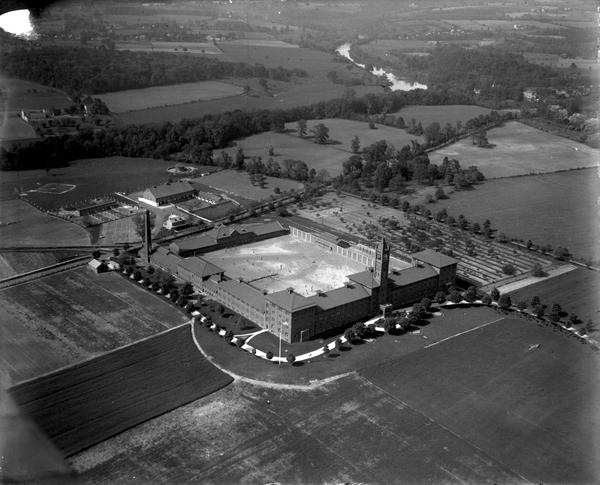 Aerial views of the Philadelphia Protectorate for Boys located near Audubon, Lower Providence Township, Pennsylvania. Depicts
