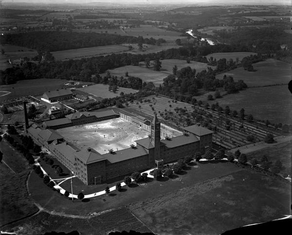 Aerial views of the Philadelphia Protectorate for Boys located near Audubon, Lower Providence Township, Pennsylvania. Depicts