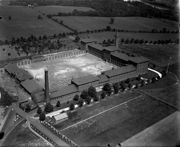 grounds and environs of institution, including the main u-shaped, multi-storied brick building and courtyard populated with