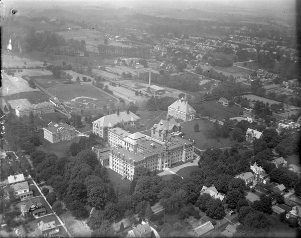 Aerial view of the West Chester State Normal School campus located in West Chester, Pennsylvania. Originated in 1812 as West Chester Academy, then was renamed West Chester Normal School in 1871. In 1913 the Commonwealth of Pennsylvania became owner of the school. It was renamed again in 1983 as West Chester University of Pennsylvania.