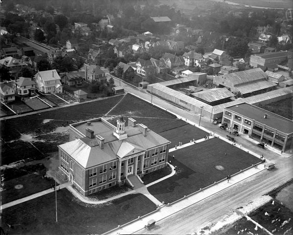 Aerial view showing Salem High School in Salem, New Jersey. Depicts columned entrance of two-story brick school building (constructed 1906) as well as nearby homes, a lumberyard, and pedestrian and automobile activity.