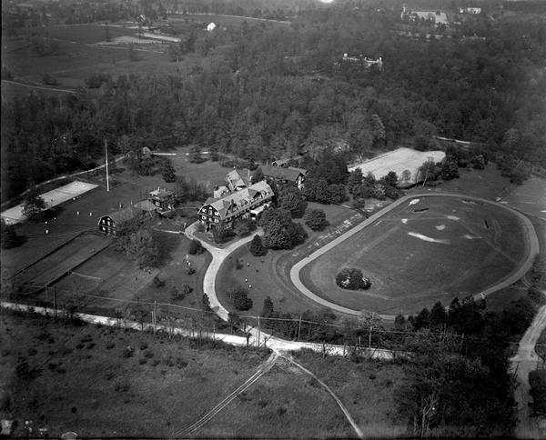 Aerial view of St. Luke's School for boys in Wayne, Pennsylvania. Depicts Colonial-style buildings and dormitories and tennis courts surrounded by woodland. Established in 1863 as the Ury House School, it relocated to Wayne in 1902.