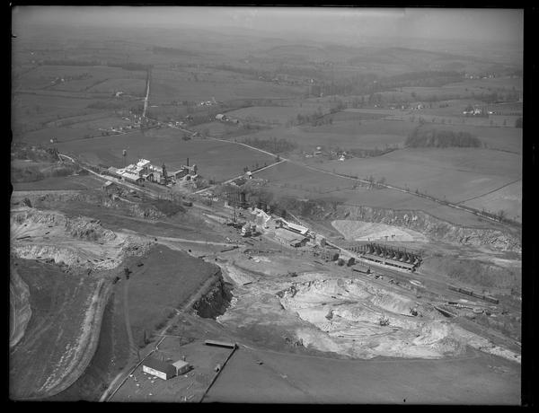 Aerial view of the Charles Warner Company factory plant in Cedar Hollow, Pennsylvania, near Malvern. Depicts strip mining