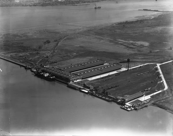 Aerial views of the Port of Wilmington showing marine cargo sheds and marine terminals, stacks of shipping containers and other industrial buildings and facilities related to the shipping industry. One cargo ship is docked. Construction of the port was completed in 1922 and it officially opened in 1923. The port is located at the confluence of the Delaware and Christina Rivers.