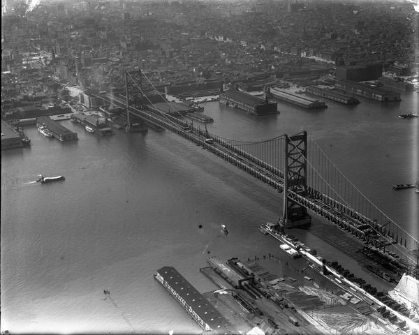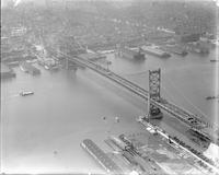 Aerial views of the Benjamin Franklin Bridge, originally named the Delaware River Bridge, under construction over the Delaware