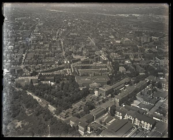 Aerial view of the University of Pennsylvania, particularly the Quadrangle dormitories and surrounding area.