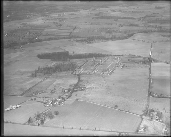 Aerial views. Depicts original hospital buildings including male and female dormitories or "groups" constructed between 1906