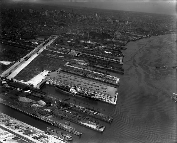Aerial views of a Luckenbach Lines ship sailing and docked in the Delaware River. Piers and industrial facilities are visible along the riverfront at Delaware Avenue between Snyder and Oregon Avenues. Various types of boats and watercraft sail on the river. The Philadelphia skyline can be seen in the distance.