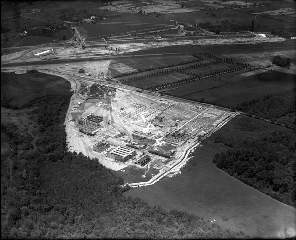 Aerial views of the Hiltonia neighborhood in Trenton, New Jersey's West Ward. Views show the development at its beginning stages with streets delineated but very few houses completed. Surrounding developed communities are visible in the distance