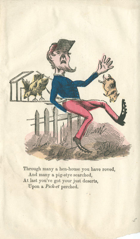 Text: Through many a hen-house you have roved, / And many a pig-stye searched, / At last you've got your just deserts, / Upon a Pick-et perched.