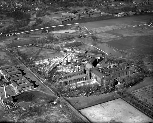 Aerial view of the Philadelphia House of Correction, opened in 1874 in the Holmesburg section of Philadelphia. Depicts the razing of the original building and construction of a new facility using the old materials. Holmesburg Prison can be seen in the distance.
