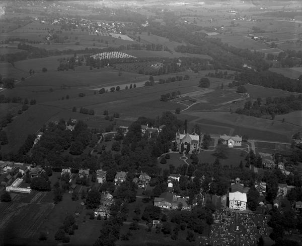 Aerial views of Ursinus College, located at 601 East Main Street, Collegeville, Pennsylvania. Includes Bomberger Hall, built