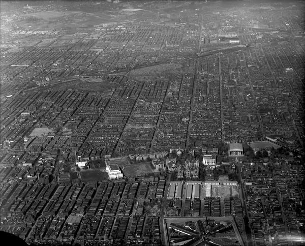 High-altitude aerial view of Girard College at Girard Avenue including Founder's Hall and the eastern and western outbuildings. The school buildings, designed by Philadelphia architect Thomas Ustick Walter in the Greek Revival style, were constructed 1833-1847. Girard College was established through a bequest from Stephen Girard, a Philadelphia financier and philanthropist, for the creation of a school for poor white male orphans. It opened in 1848. Eastern State Penitentiary is visible in the foreground. View looks north and includes North Philadelphia.