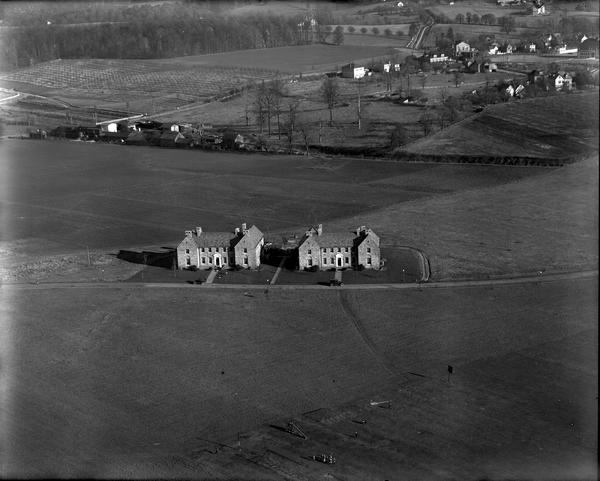 Aerial views of the Charles E. Ellis College for Fatherless Girls in Newtown Square, Pennsylvania. Depicts stone cottages