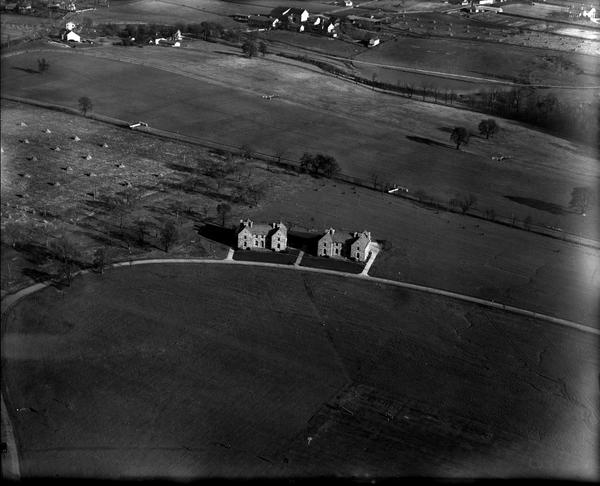 Aerial views of the Charles E. Ellis College for Fatherless Girls in Newtown Square, Pennsylvania. Depicts stone cottages