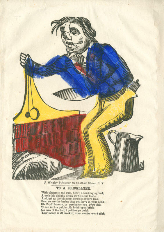 Text: With plummet and rule, here's a bricklaying fool; / A can's his delight, and a trowel's his tool-- / And just as the