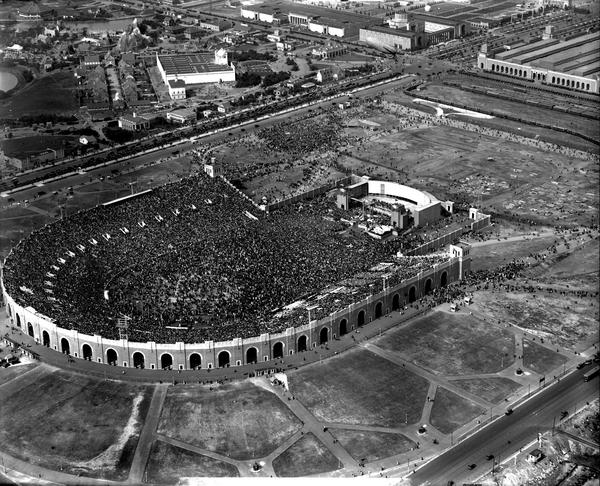 Aerial views of Catholic mass held at Municipal Stadium, later known as John F. Kennedy Stadium, in October, 1926 as part