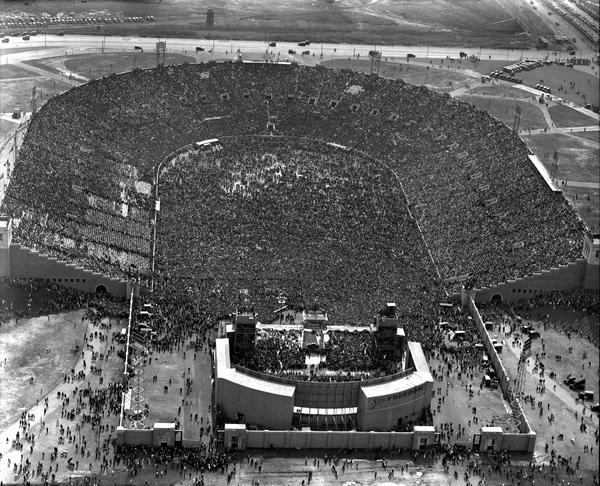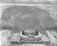 Aerial views of Catholic mass held at Municipal Stadium, later known as John F. Kennedy Stadium, in October, 1926 as part