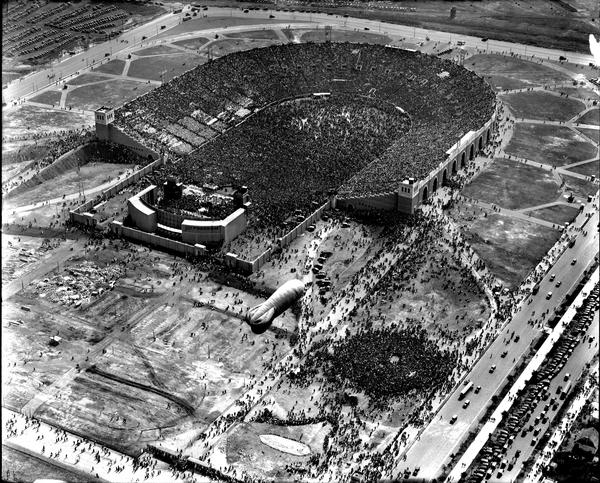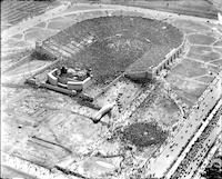 Aerial views of Catholic mass held at Municipal Stadium, later known as John F. Kennedy Stadium, in October, 1926 as part