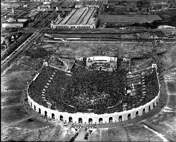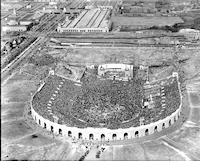 Aerial views of Catholic mass held at Municipal Stadium, later known as John F. Kennedy Stadium, in October, 1926 as part