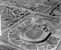 and other areas of the exposition site are also visible. Stadium was designed by the Philadelphia firm Simon & Simon. Located