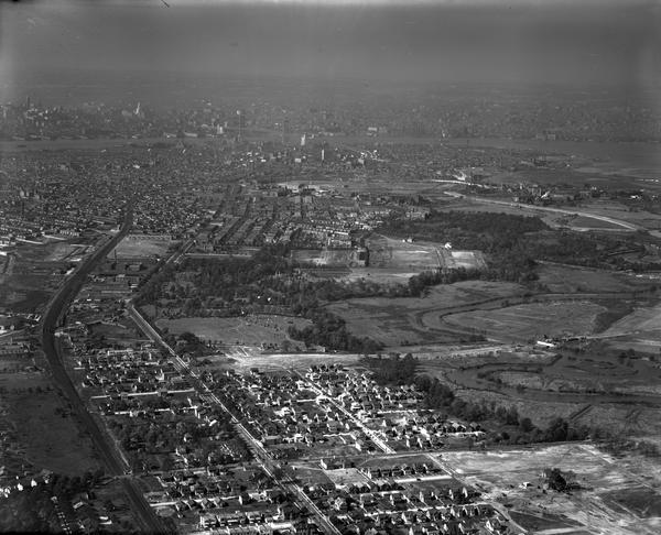 Aerial views of the construction of Crescent Boulevard Bridge. Initial construction began in 1926 of Crescent Boulevard (US