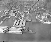 Aerial views of the Van Sciver Corporation located on the Camden, New Jersey waterfront along the Delaware River. The Van Sciver Corporation manufactured and distributed building materials in New Jersey and Pennsylvania, including much of the stone and concrete materials for projects such as the Benjamin Franklin Bridge and the piers for major shipbuild facilities along the Delaware River. The facility can be seen from several angles and various types of building materials stacked on the piers and ships sailing nearby.