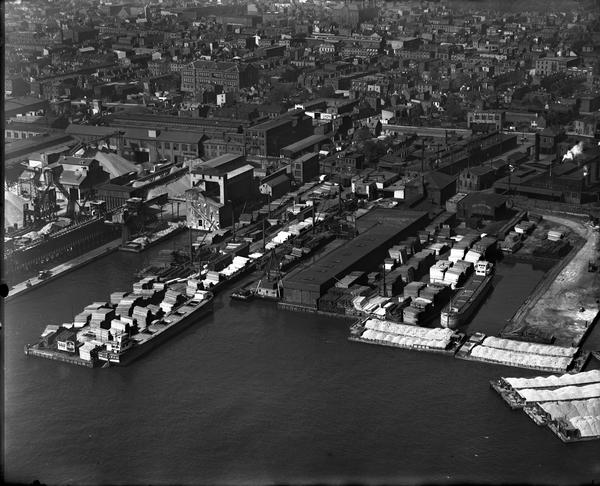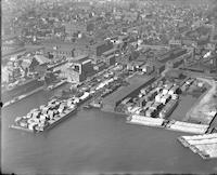 Aerial views of the Van Sciver Corporation located on the Camden, New Jersey waterfront along the Delaware River. The Van Sciver Corporation manufactured and distributed building materials in New Jersey and Pennsylvania, including much of the stone and concrete materials for projects such as the Benjamin Franklin Bridge and the piers for major shipbuild facilities along the Delaware River. The facility can be seen from several angles and various types of building materials stacked on the piers and ships sailing nearby.