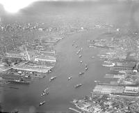 Aerial views of a fleet of ships sailing down the Delaware River. Good portions of the riverfronts of Camden and Philadelphia are visible; Center City and the Benjamin Franklin Bridge can be seen in the distance. View looks northwest from the New Jersey side of the river south of Camden.
