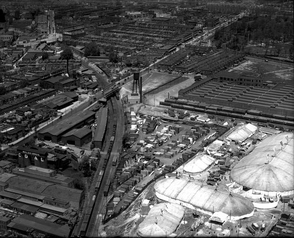 Aerial views of the Ringling Brothers Barnum and Bailey Circus in the neighborhood of North Philadelphia. Depicts vicinity