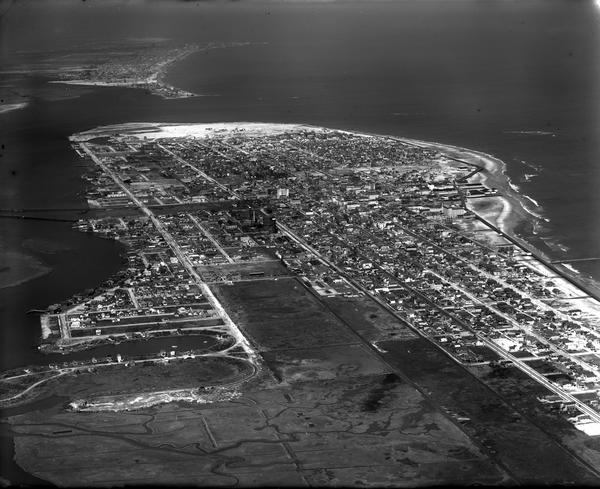 Aerial views of Ocean City, New Jersey looking northeast towards Great Egg Harbor Inlet and Longport. The entire northeast portion of the island is visible, as are portions of Great Egg Harbor Bay and the Atlantic Ocean.