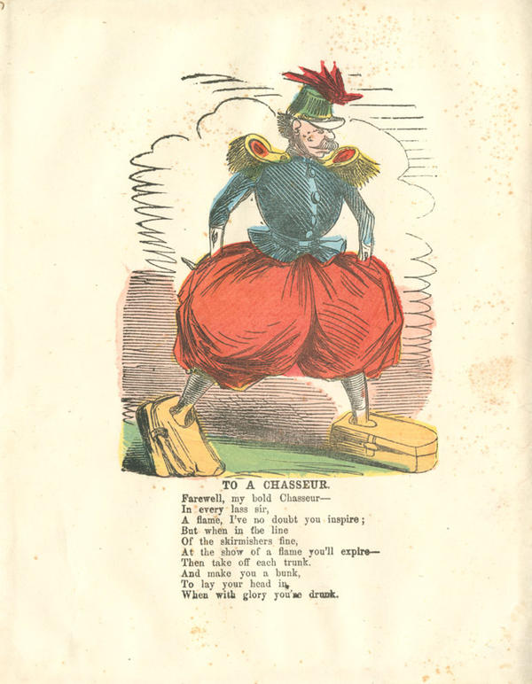 A Union soldier wears baggy, short red pants, a cap with a red crest, and box-like shoes. The valentine mocks the Chasseur's