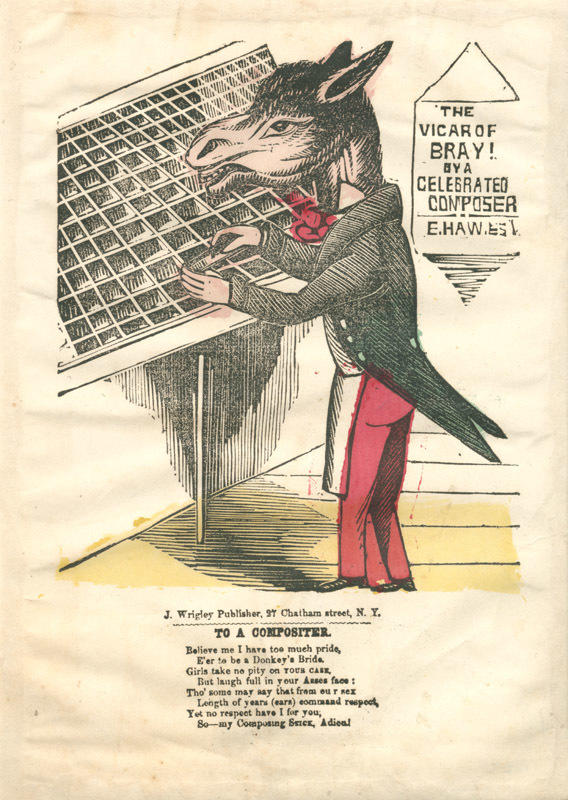 A man with a donkey's head stands in front of a printing press. Behind him is a sign that reads "The Vicar of Bray! By a Celebrated