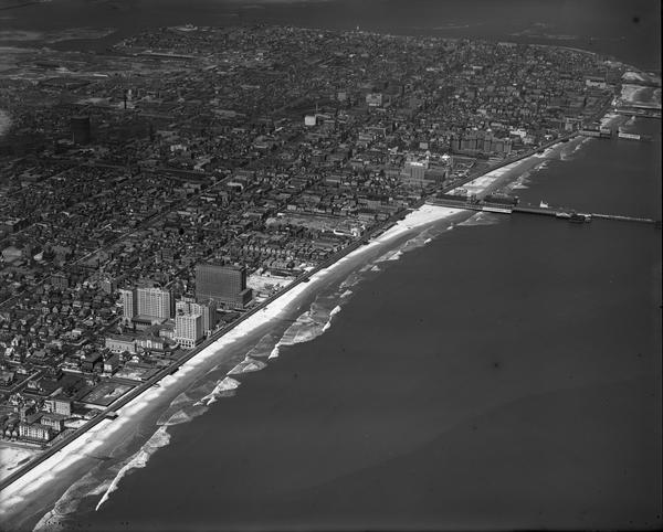 Aerial views of the coastline in Atlantic City, New Jersey. Distant views show the shoreline in sections from the vicinity