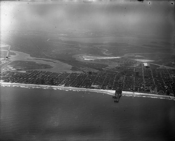 Aerial views of the coastline in Atlantic City, New Jersey. Distant views show the shoreline in sections from the vicinity